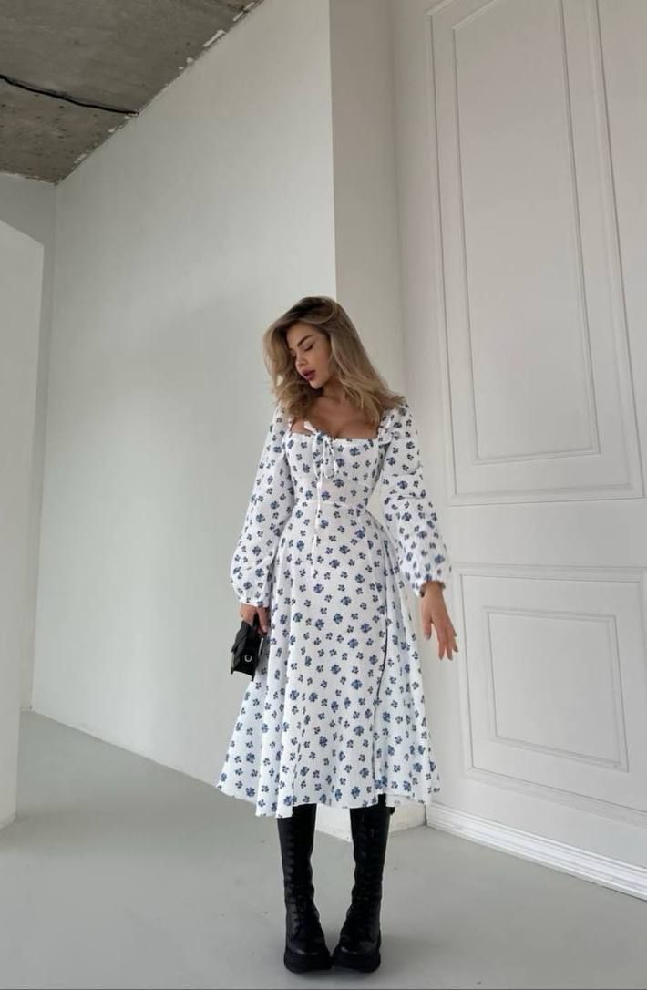 Жіноча муслінова сукня біла в блакитну квіточку №595386