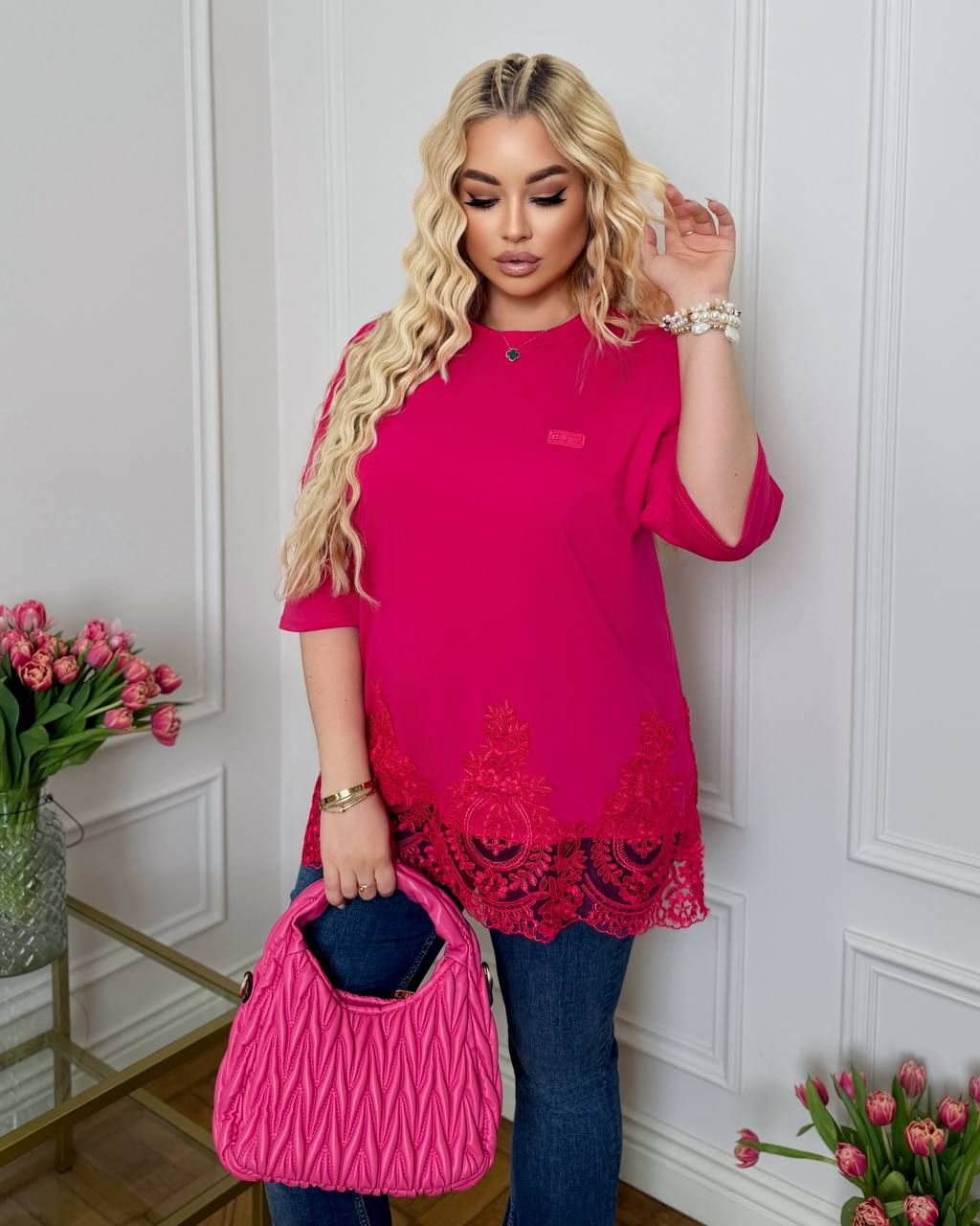 Подовжена футболка в стилі OVER рожева №597545