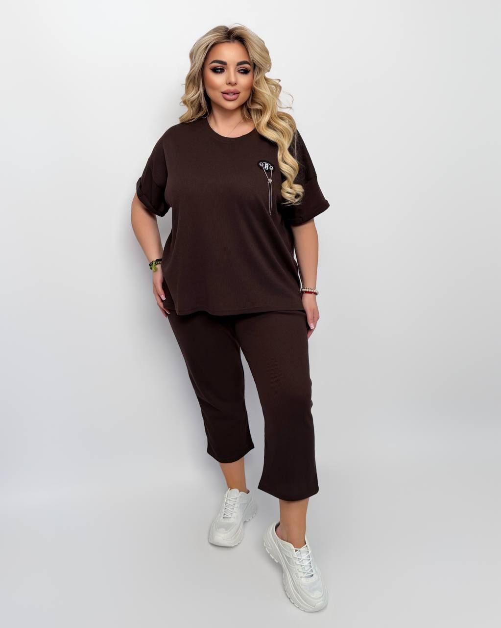 Вільний спортивний костюм з трикотажу «Вафелька» шоколад №597975