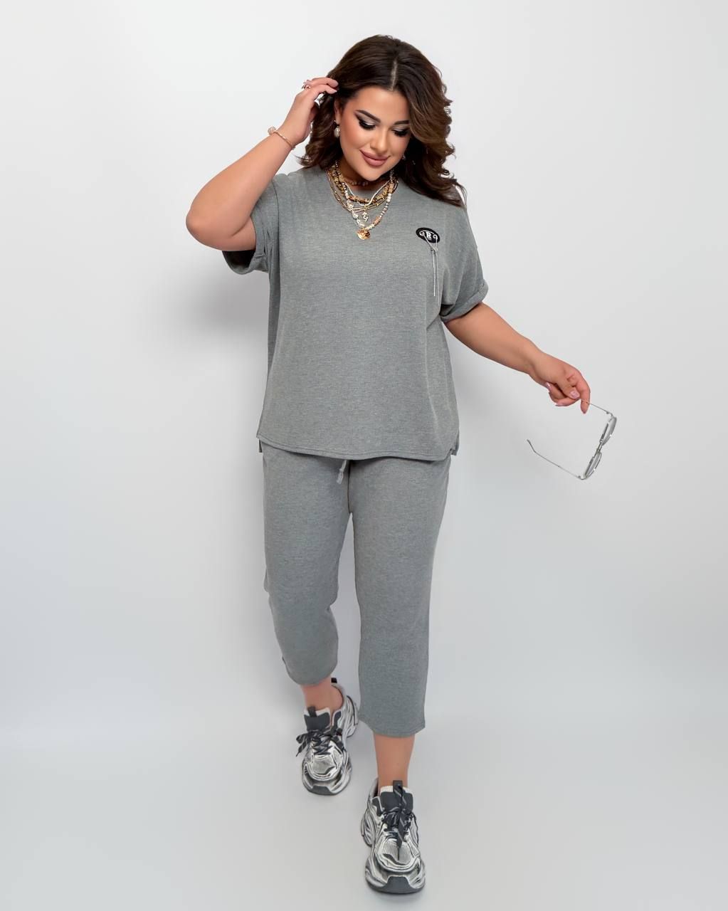 Вільний спортивний костюм з трикотажу «Вафелька» сірий №597978